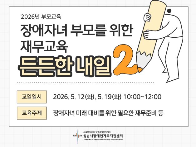 1차 | 2026. 5. 12(화) 10:00~12:00 | 기초과정 - 생애주기별 재무준비 5단계 : 자녀 생애재무곡선 그리기, 단계별 재무 준비(계획부터 목표금액 마련 및 대책 마련까지) | 성남시 거주 및 생활권자 장애자녀 부모 |